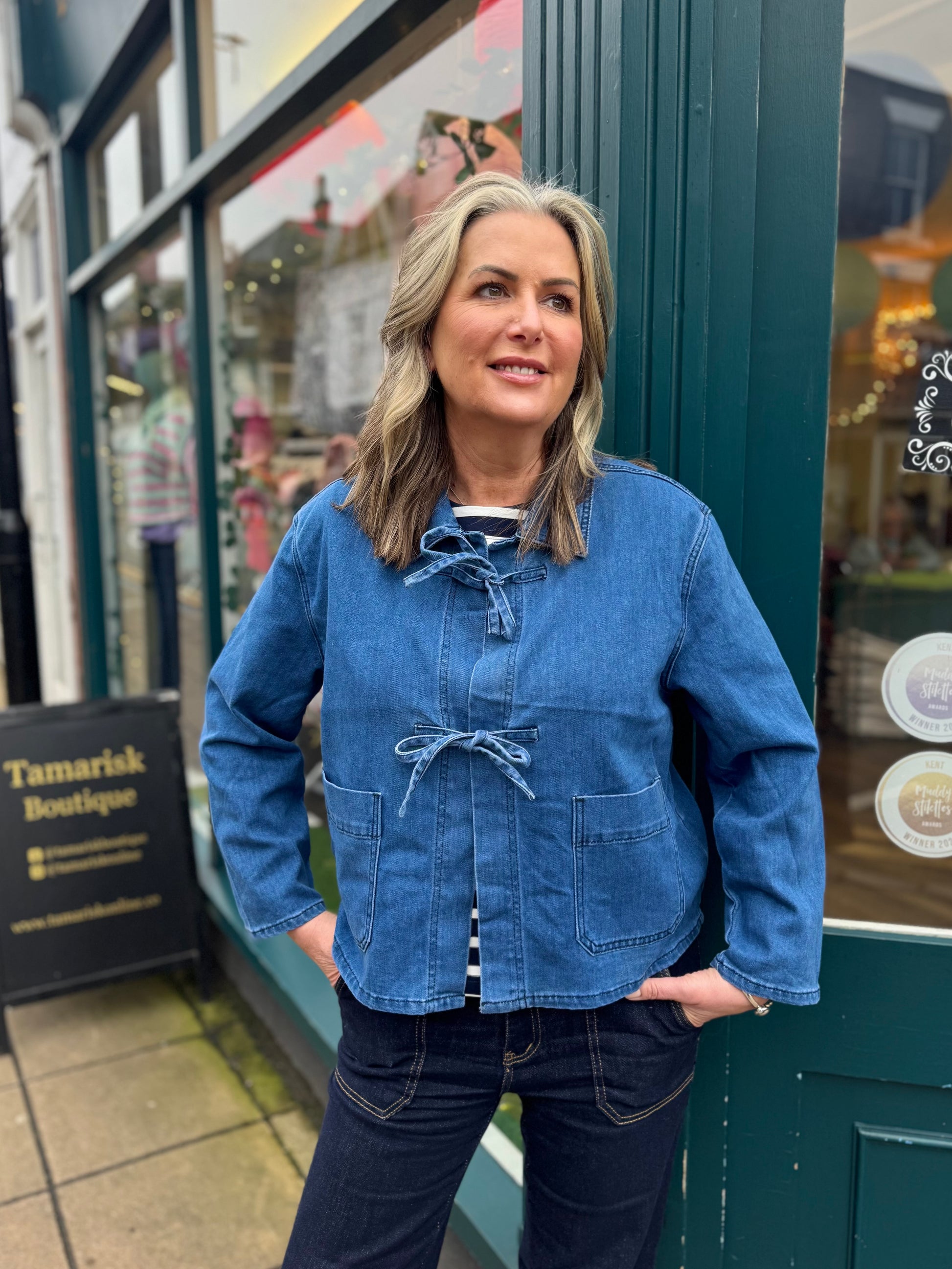 Soft stretch denim, a flattering easy shape, and the sweetest bow tie fastenings instead of buttons. It gives that slightly feminine, slightly utility feel that makes an outfit look thought-through, not just thrown on.