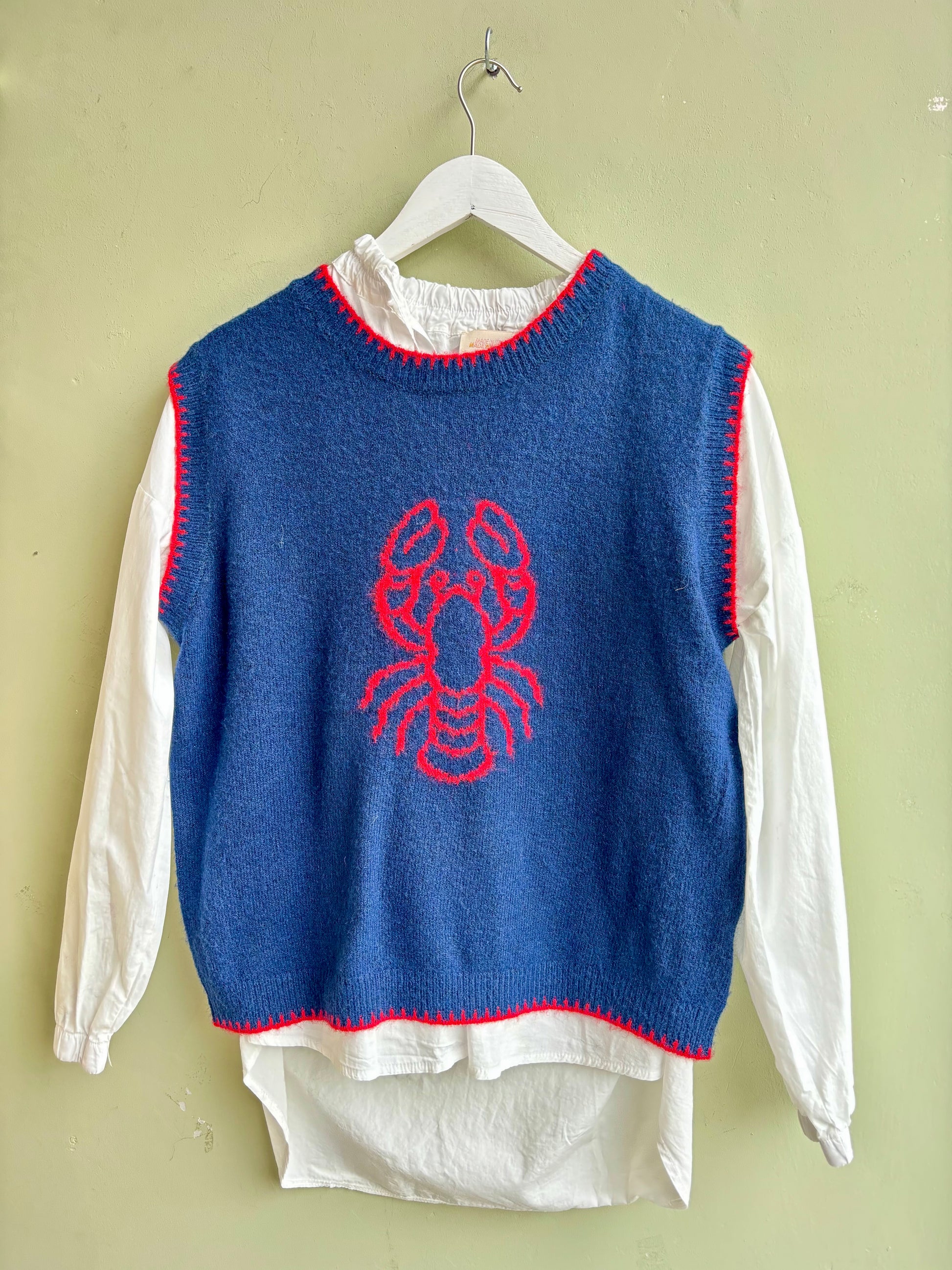 Alpaca Blend Lobster Tank Top - Navy & Red, With Red Blanket Stitch Trim