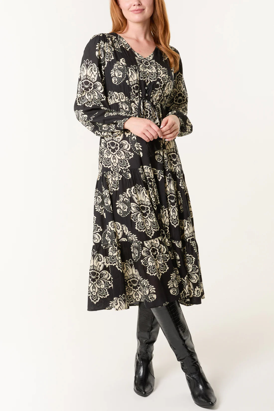 Chloe Empire Line Long Sleeve Midi Dress - Black Or Burgundy Floral Print