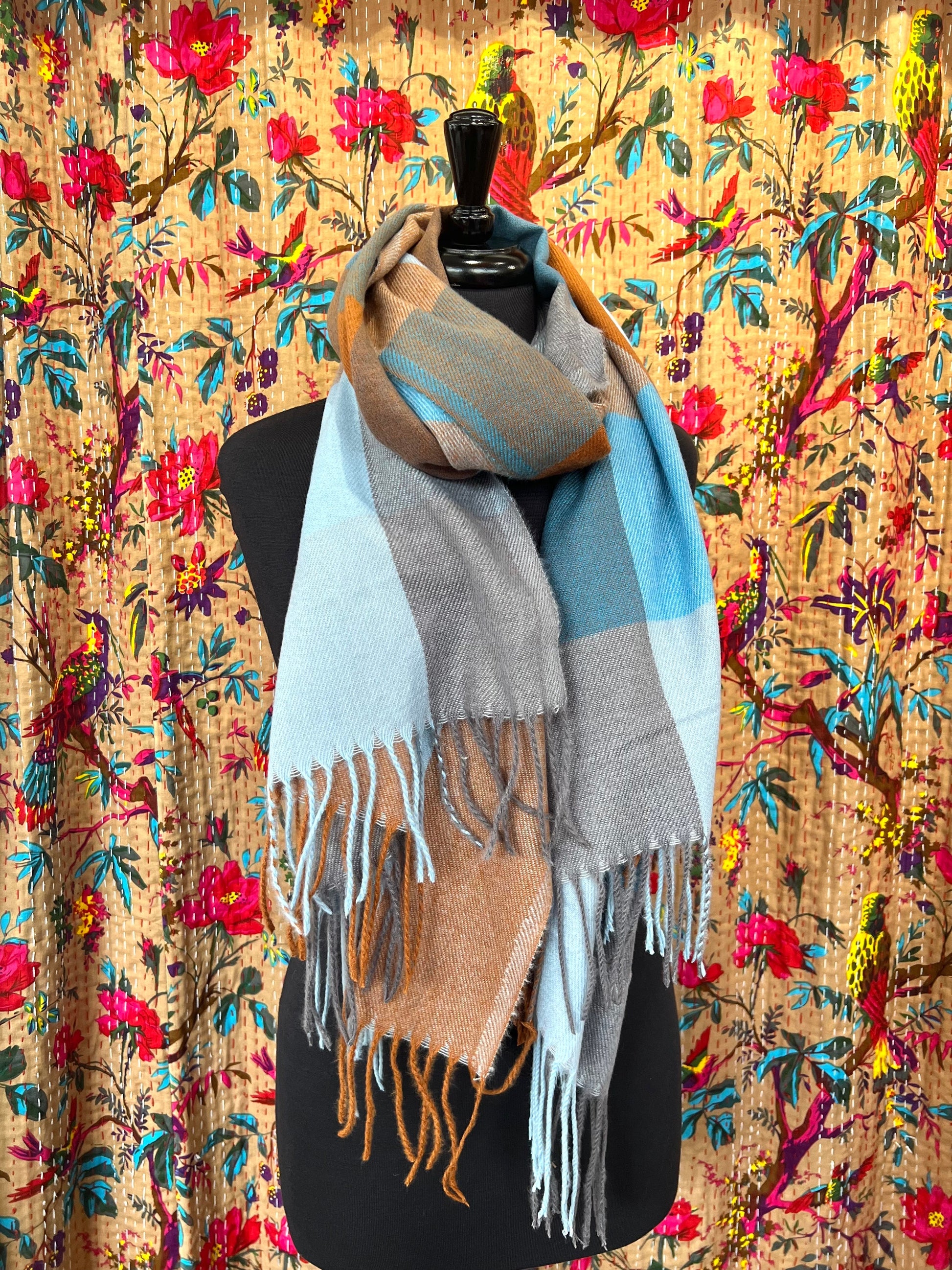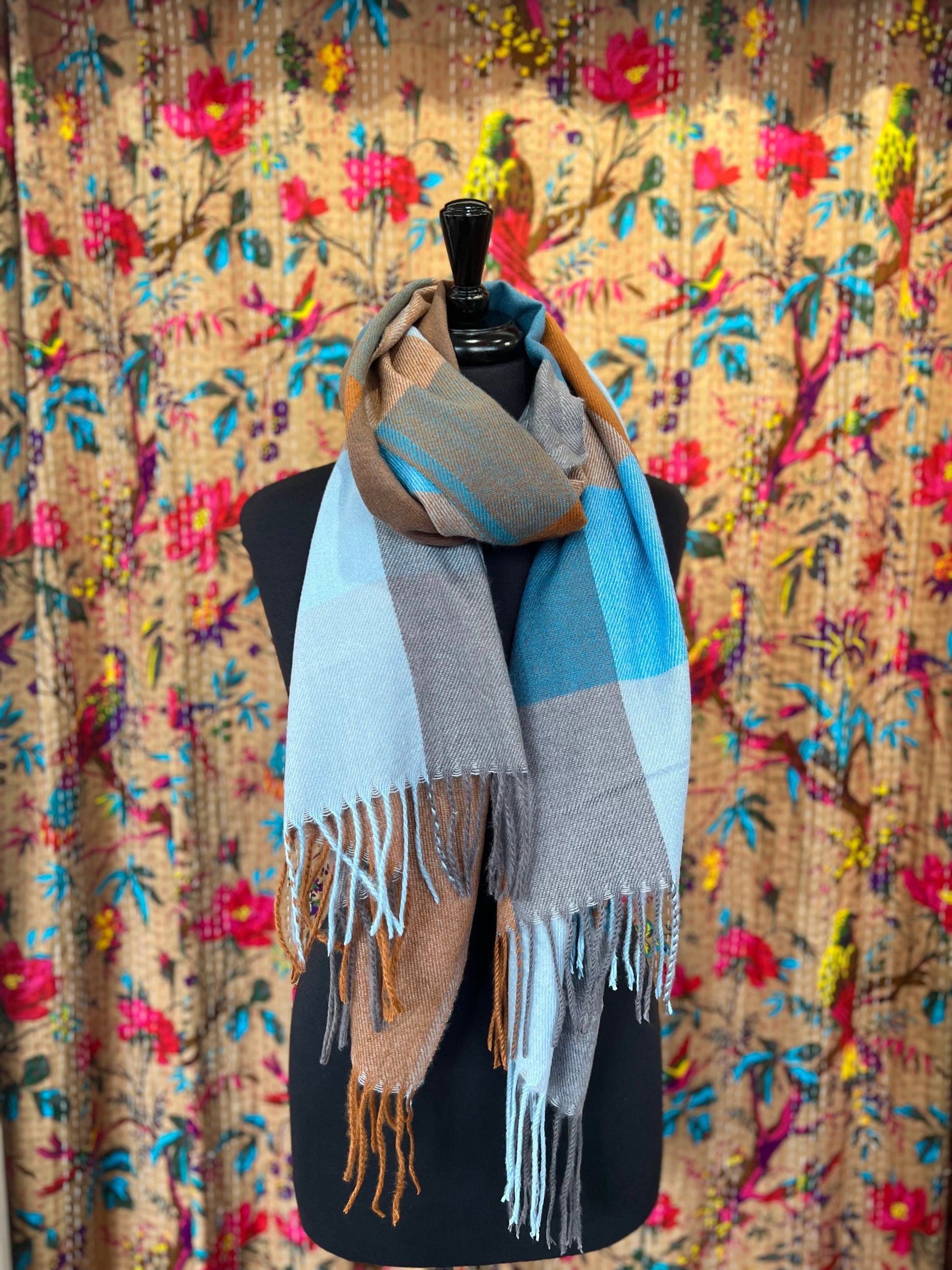 Add instant warmth and style with our soft, lightweight pashmina-style blanket in a muted blue, teal and camel check design. Made from a premium wool blend, it’s cosy yet non-bulky — the perfect layering piece for indoors or out.