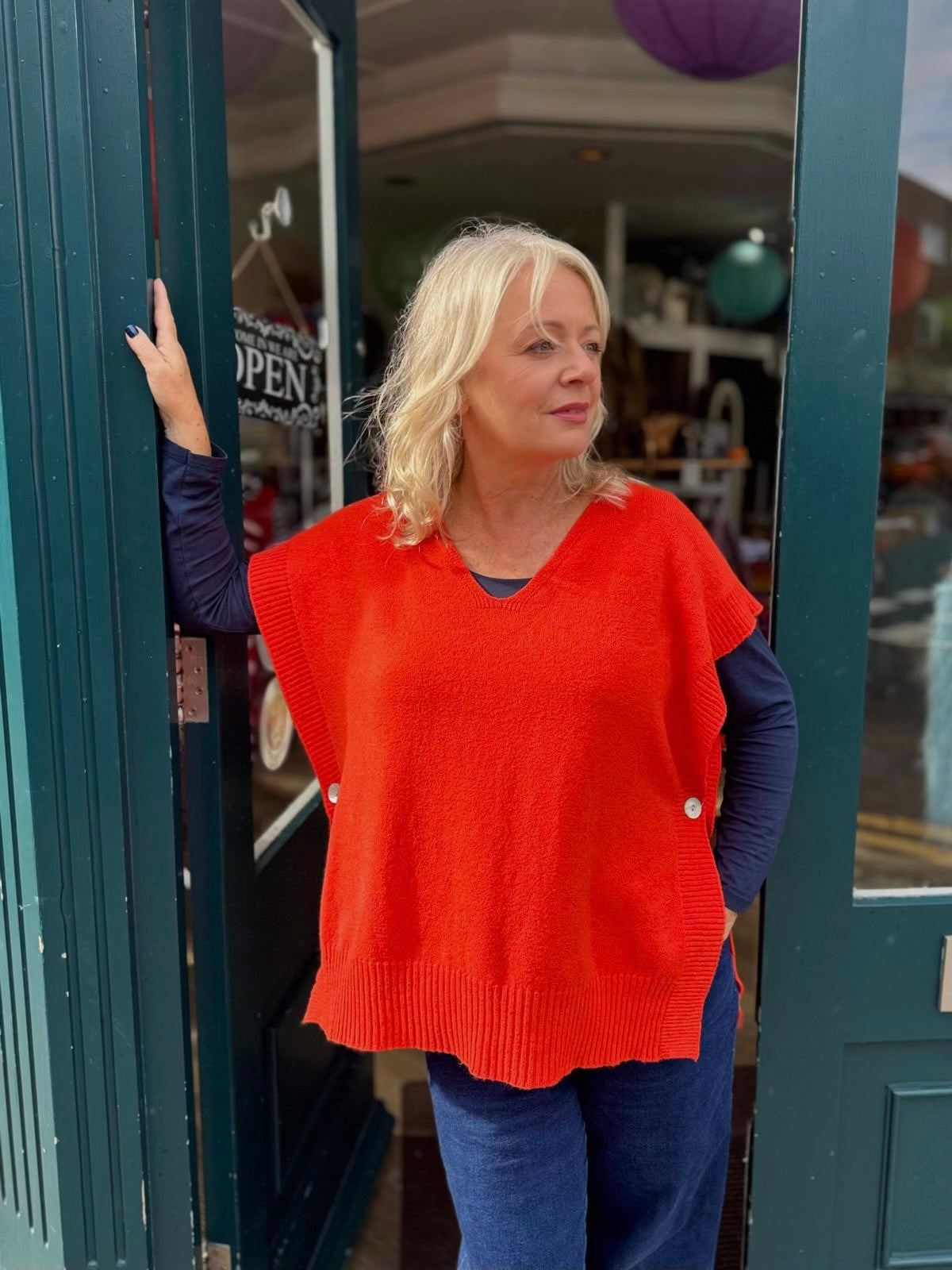 Loose V neck jumper with wide, short sleeves and side button fastening