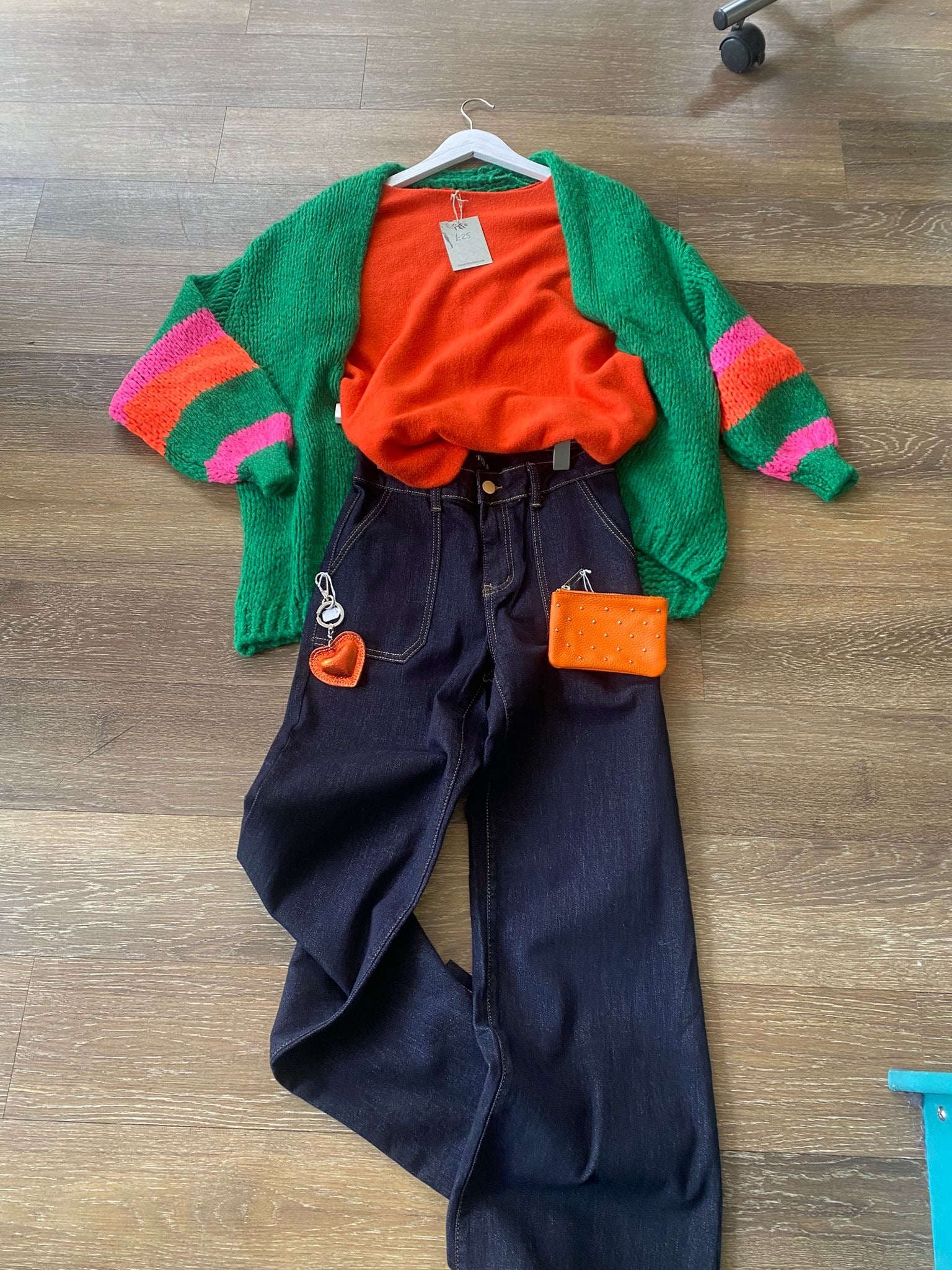 Make grey days brighter with this bold kelly green cardigan. Its chunky knit and balloon sleeves give it that easy, cosy feel, while the wide multi-striped cuffs add a pop of fun colour that sets it apart from the usual basics.
