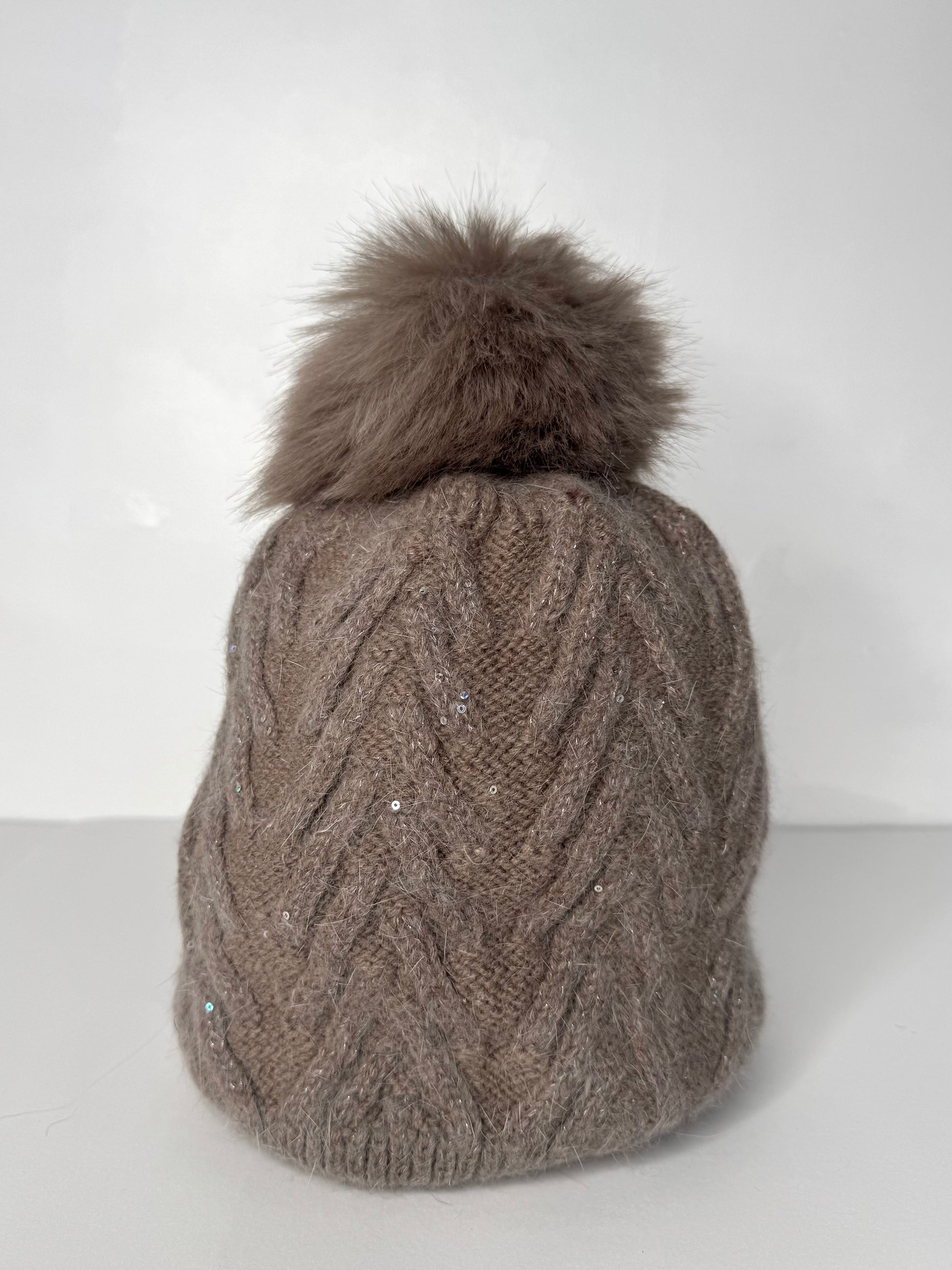 Sinead Muted Pastel Wool Blend Cable Knit Faux Fur Pom Pom Hat - Subtle Sequin Trim - Pastel Blue, Soft Grey, Soft Taupe