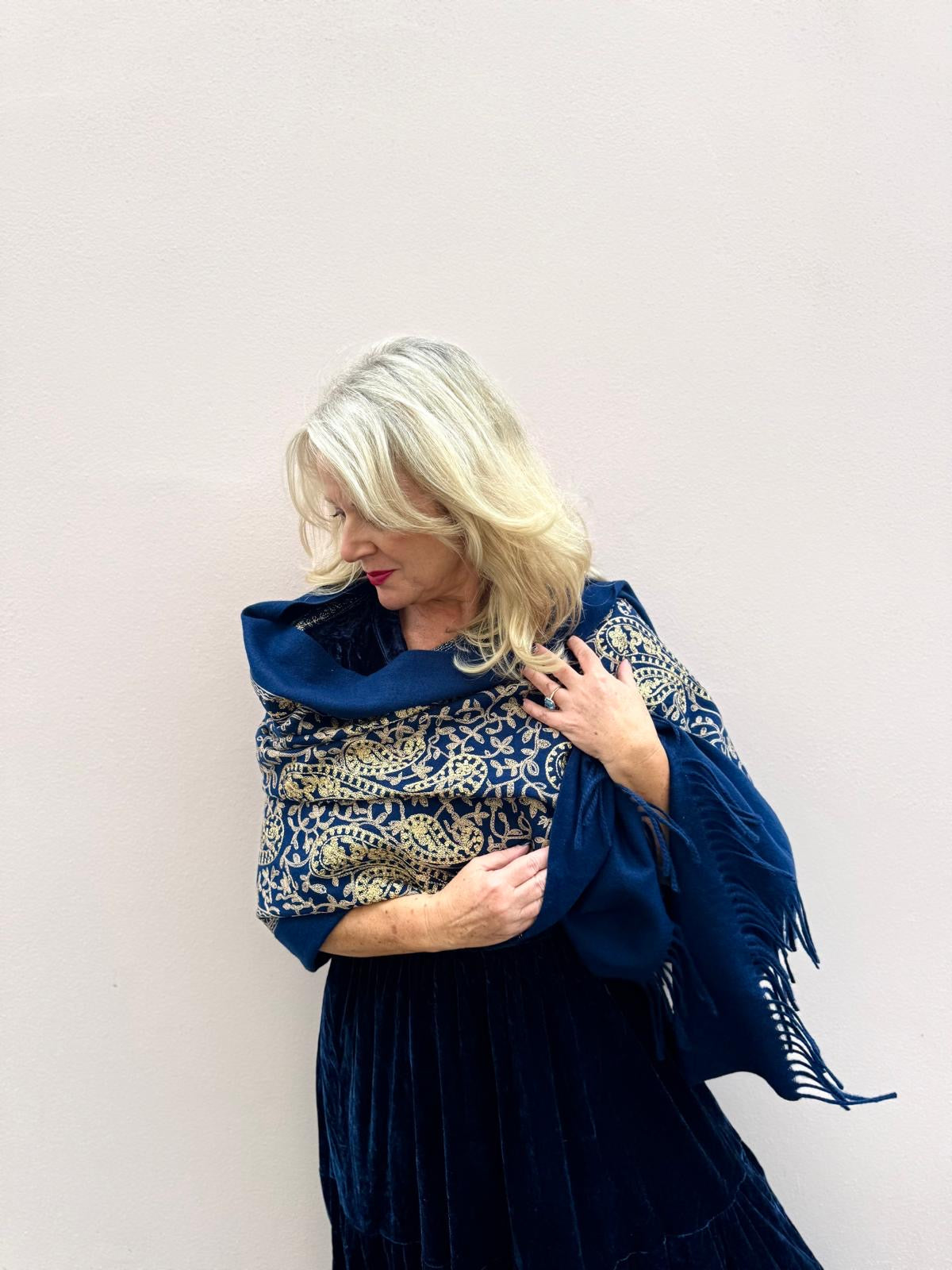 Add instant drama to your winter look with this luxurious gold embroidered pashmina scarf. Made from a soft wool blend, it features intricate gold paisley embroidery on a choice of rich navy or classic black. The long rectangular shape and fringed edges give it a classic elegance, perfect for dressing up eveningwear or elevating a simple coat and jeans.